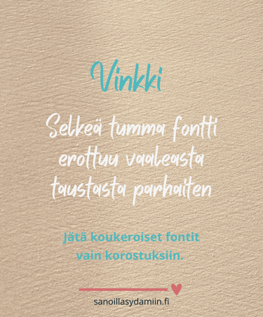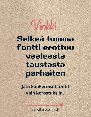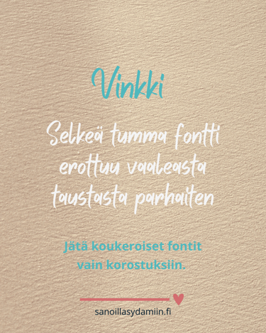 Tarkkana kannattaa olla fonttien ja värien kanssa. Pienet, vaikealukuiset tekstit hukkuvat helposti, varsinkin kännykän pienellä näytöllä. Vaalealla taustalla tumma fontti toimii lähes aina. Koukeroiset fontit kannattaa säästää yksityiskohtiin – selkeys menee aina edelle.