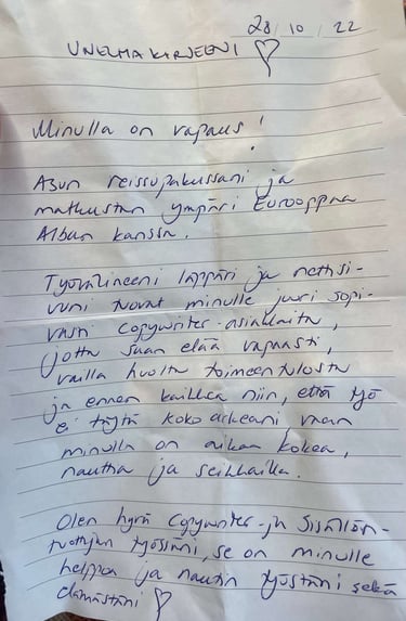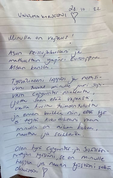Ihana copywriter-opettajamme Saara antoi meille portfolio-kurssillamme tehtävän: Meidän tuli kirjoittaa kirje itsellemme, johon kerromme, missä näemme itsemme vuoden kuluttua. Sitten sinetöimme sen kirjekuoreen, jonka päälle kirjoitimme: ”Oma unelma. Saa avata 28.10.2023.”